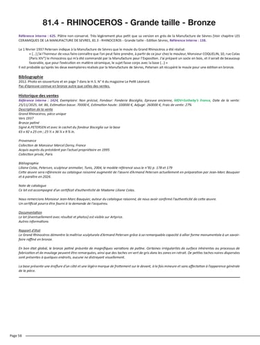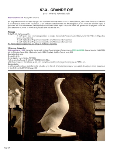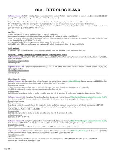 Notre référence interne de la vente, le numéro de l’exemplaire, le nom du fondeur, épreuve ancienne ou post-mortem, la maison de vente, la date de la vente, le numéro du lot, les estimations basses et hautes, le prix adjugé, le taux de commission ainsi que la description de la vente telle qu’elle a été indiquée par la maison de ventes.